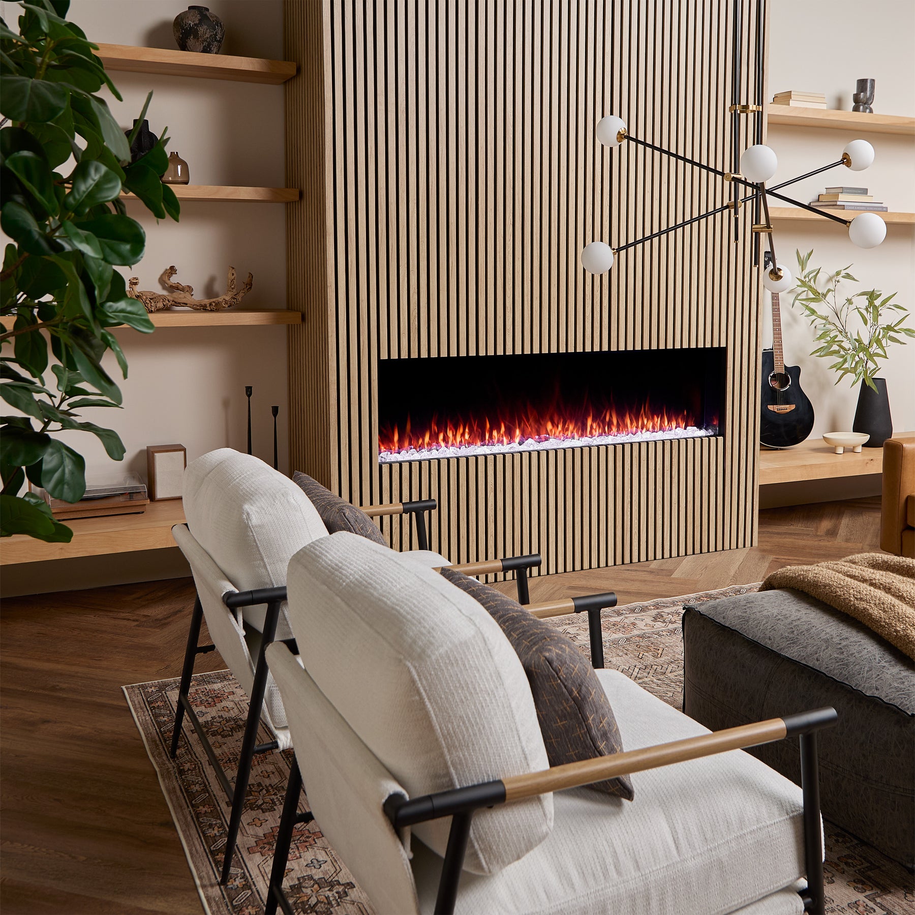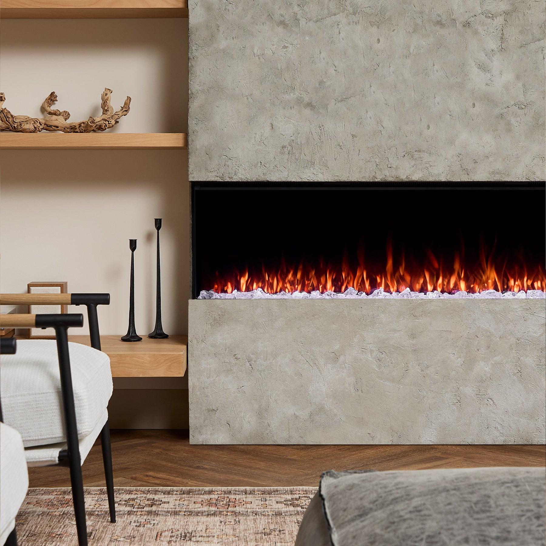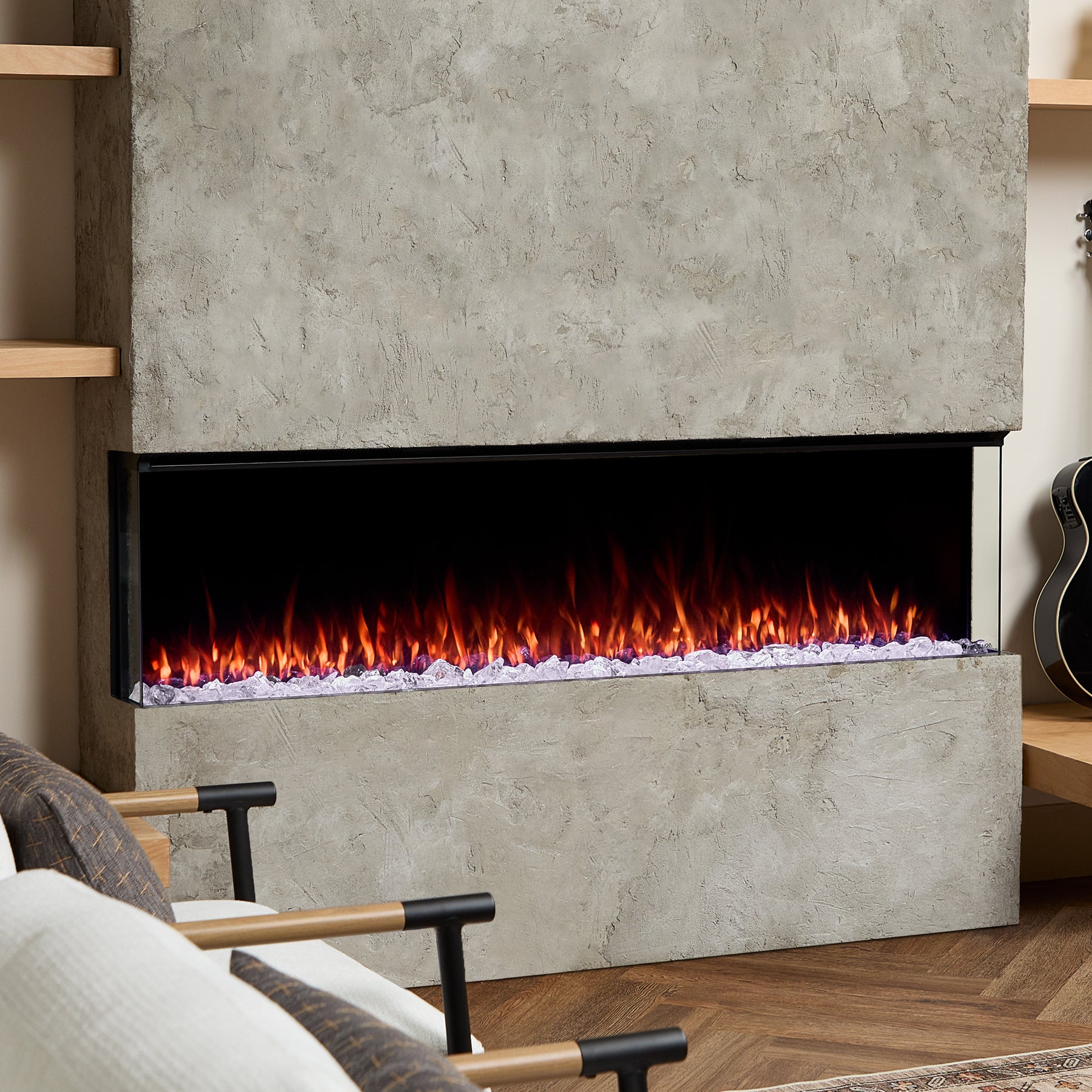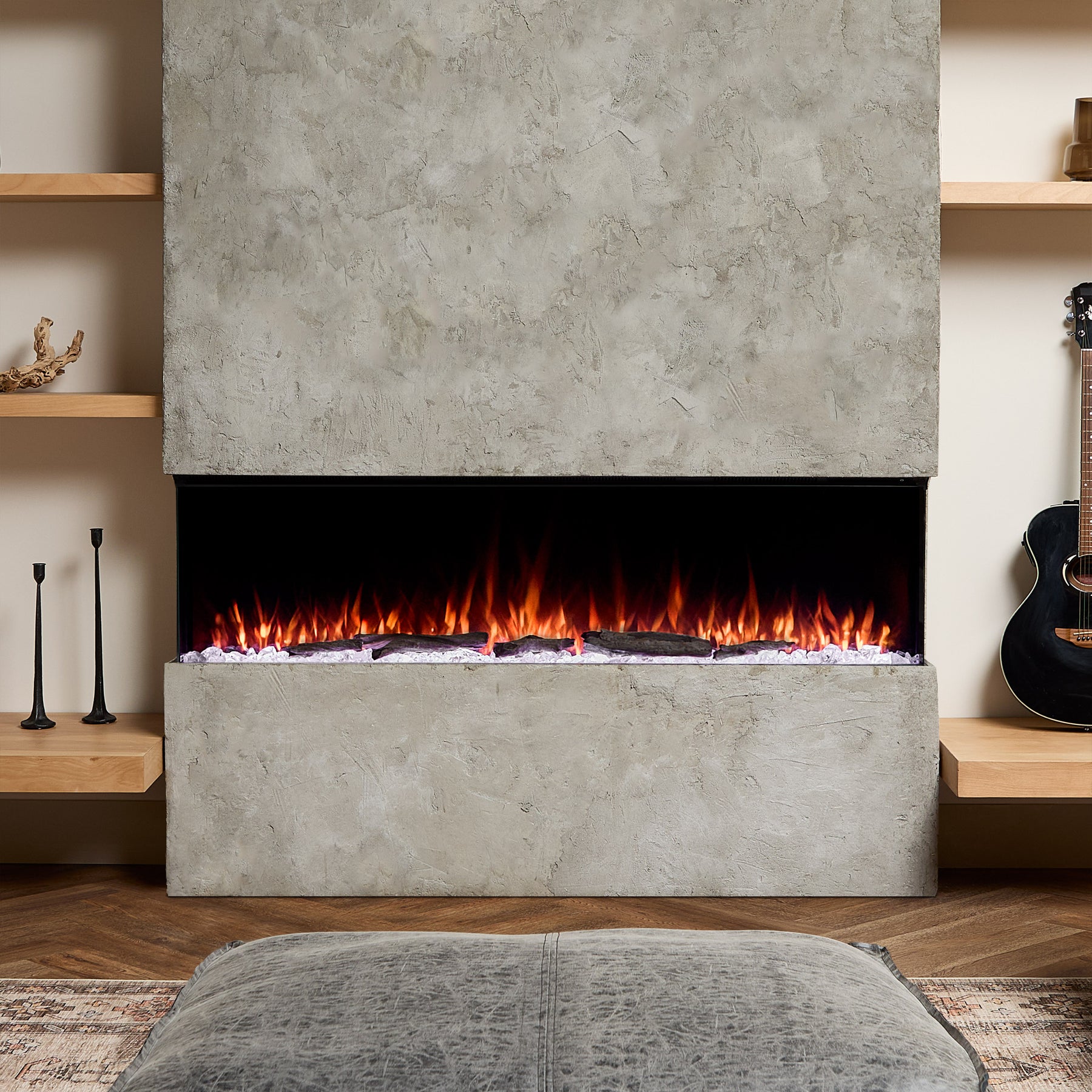 Create a bold and immersive focal point with the Real Flame® 3-Sided Smart Electric Fireplace. Designed for elevated interiors, this next-generation electric fireplace reimagines the warmth and allure of a traditional fire through our advanced AuraFlame™ technology, showcasing a mesmerizing 3D flame effect with exceptional depth, movement, and realism—without the need for vents or gas lines. Conveniently plugs into a standard outlet or can be hardwired. Engineered for design versatility, this modern indoor firebox supports recessed, two-sided corner, or full three-sided built-in installations, creating a seamless, custom look from multiple viewing angles. Personalize the aesthetic and curate your environment with over 50+ flame and ember colors, adjustable flame brightness and speed, and custom thermostat settings, all controlled from the Real Flame Bluetooth Smart Tech App, remote control or touchscreen. This electric fireplace insert provides supplemental heat for rooms up to 1,000 sq ft or the heater can be turned off so you can enjoy the comforting ambiance of a glowing fireplace year-round. Firebox with crystal glass filler and driftwood log set, hardware, downloadable app and remote control are included. At Real Flame Company, we are committed to providing beautifully designed, safe, high-quality indoor electric fireplaces, outdoor gas fire pits and fire tables, and outdoor furniture.
